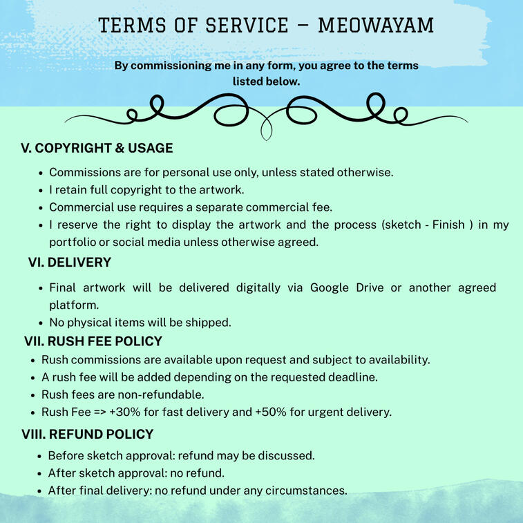 Each artwork I create is a fully custom piece, carefully designed around your idea, story, or character.When you commission me, you’re not just receiving an illustration—you’re investing in a thoughtful creative experience.I take the time to understand your vision, explore poses and composition options, and share progress updates from sketch to final render.This collaborative approach ensures every piece feels intentional, personal, and refined.The prices below reflect the time, craftsmanship, and creative focus dedicated to each commission.To maintain quality and care, commission slots are kept limited.If you value artwork created with attention, intention, and heart, you’re in the right place 🤍